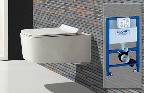 Vegghengt toalett med Grohe® lav innebygd sisterne, Nordkap-skål og SlimSeat toalettsete med Soft Lock-system.